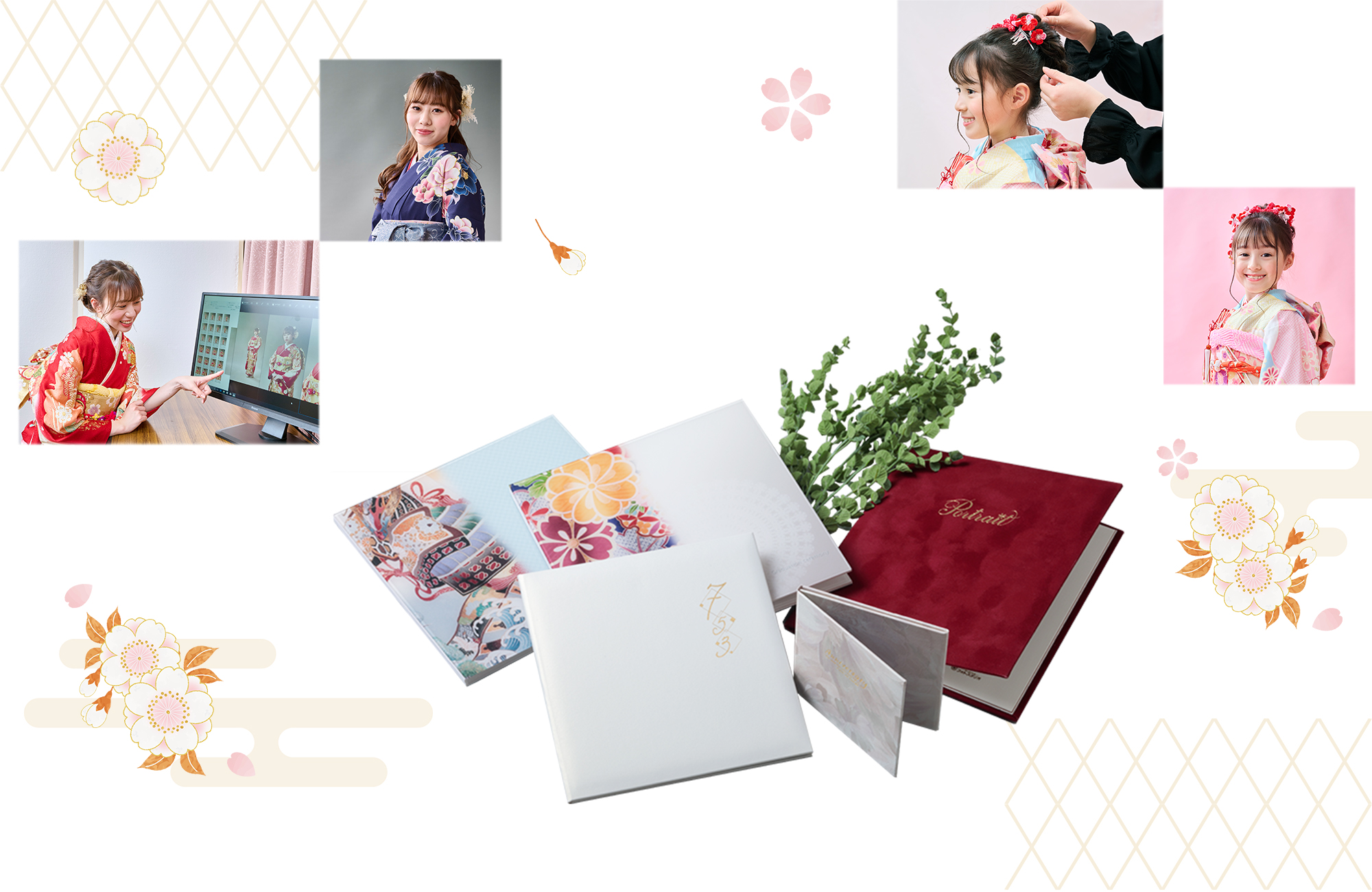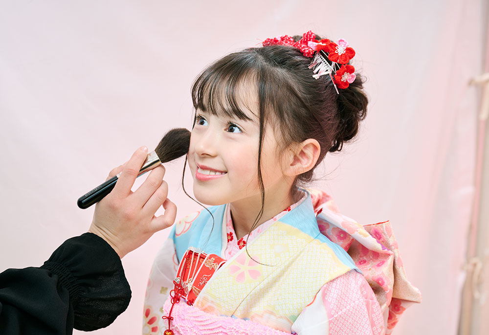 - (持ち込みご衣裳)+ヘアメイク(女児のみ)+着付け+記念写真(1ポーズ、六ツ切サイズ1枚、豪華台紙付)