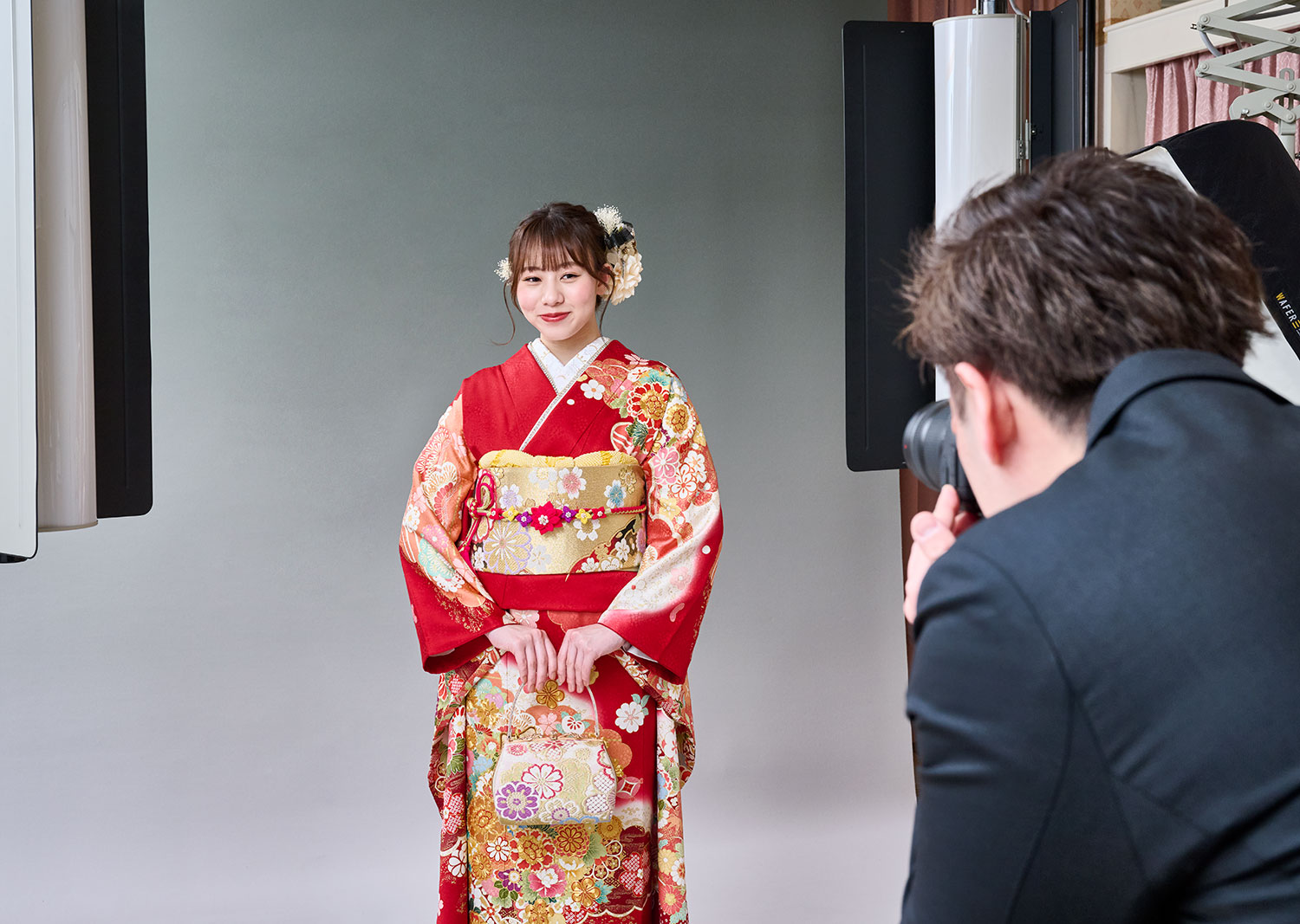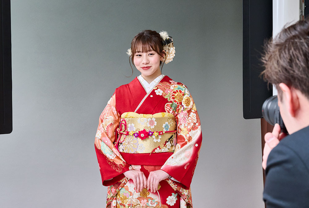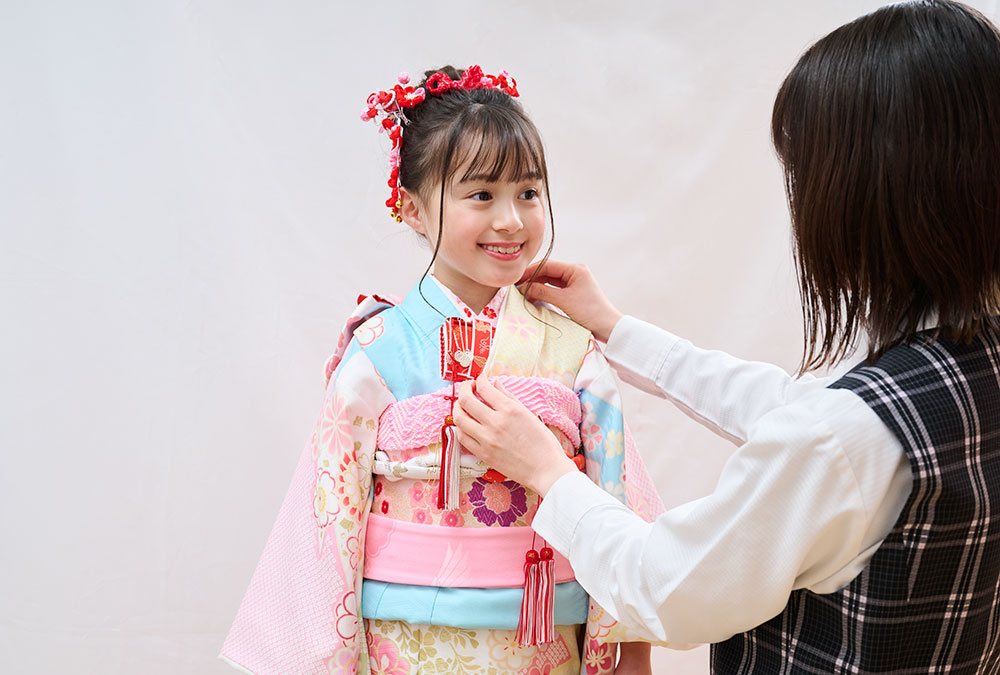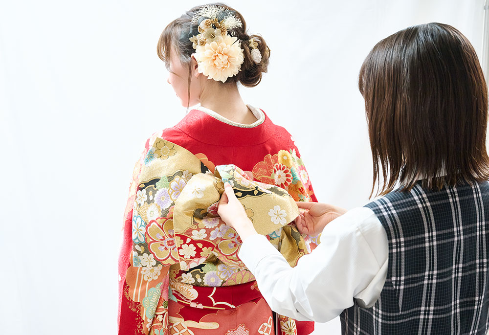いちばん美しい着姿を残していただくために、撮影を考えた着付けを専門のスタッフが行います。